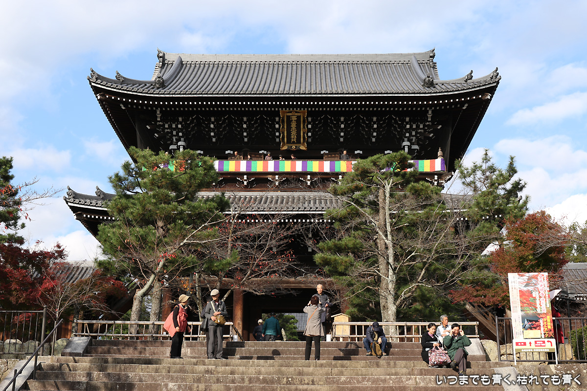 くろ谷さんと呼ばれる金戒光明寺は、相棒Season8の正月スペシャル「特命係、西へ!」で杉下右京が石段を登っていく場面、山門で神戸尊と話をしている場面のロケ地で、ロケ地大好きな私がいつか訪れてみたいと思っていたところです。今回やっと初めて訪れたのですが、とにかく山門の大きさと存在感に圧倒されました。ちょうどその山門が特別公開となっていて、相棒のふたりのように山門で京都市内を眺めることができました。残念ながら山門内は撮影方向関係なく撮影禁止だったので写真はありませんが、「あべのハルカス」までちゃんと見える眺望は素晴らしいものでした。ちなみに、「特命係、西へ!」の他のロケ地めぐりは2012年3月に実施済みです。