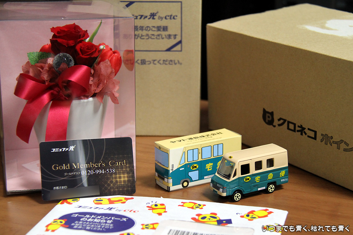 長期利用者 日記/出来事 2015年12月26日(土) 14:27 気持ちがなかなか前向きにならなくてぼやっと過ごしていることが多く、やるべきことがなかなか進まない正月休みですが、本日こんなものが届きました。 クロネコポイントで商品交換した、クロネコ宅急便車3台目となるクロネコヤマトミニカー・ウォークスルーW号車。それとコミュファ光のゴールドカード(クレジットカードではありません)と花。どちらも長く利用しているということへのささやかな恩恵ですが、長期利用者をもっと大切にすることが広がってほしいものですね。