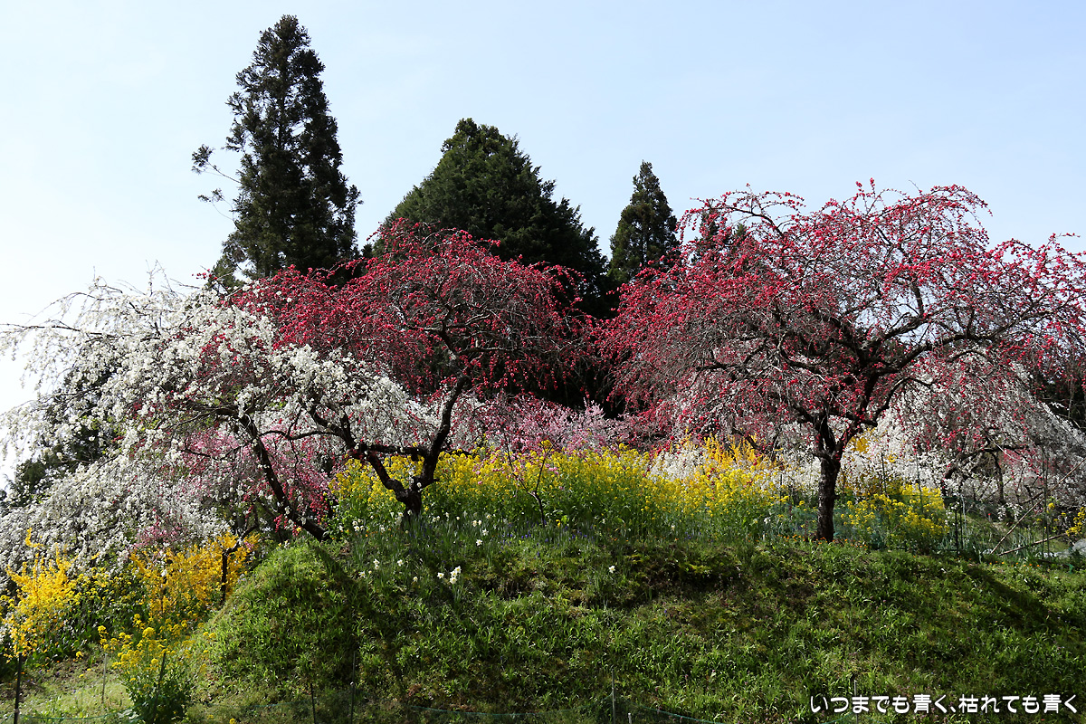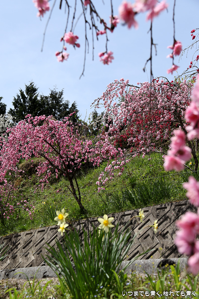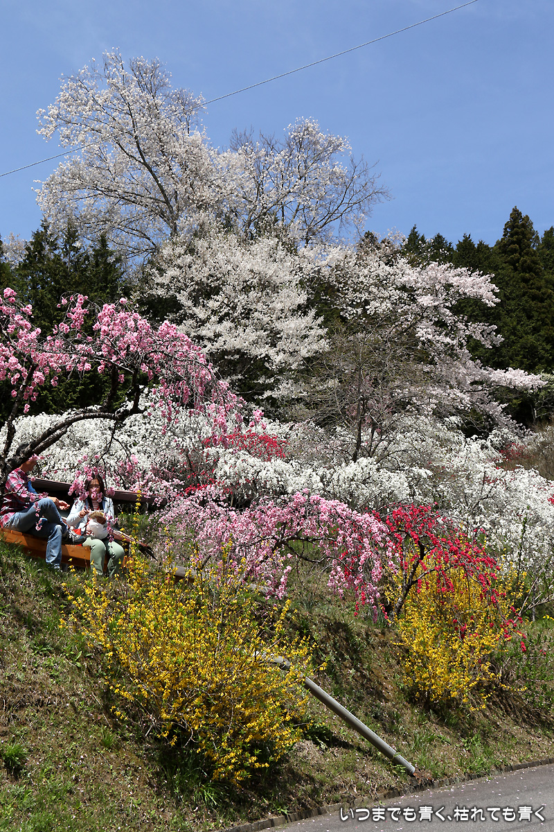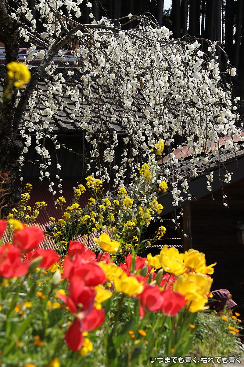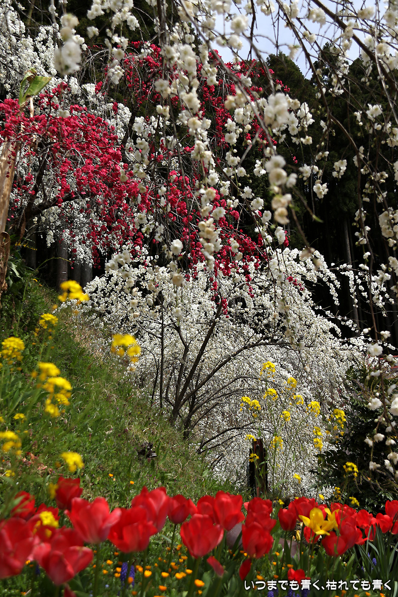 上中のしだれ桃・2016 ぶらりひとり旅 2016年4月9日(土) 20:17 昨年は時期を逸して見逃してしまった上中のしだれ桃。同じ市内にもかかわらずクルマで一時間くらいかかるところなので、今年は天気のいい日に絶対に見ようと思って、昨夜深夜3時までカラオケをしていたにもかかわらず、朝一番でクルマを走らせて見てきました。 今年は、開花の遅れていた山桜との珍しい共演を見ることができましたし、チューリップやスイセンなども咲き誇り、鮮やかな色彩との調和も素敵でした。のんびりと長閑な山間の道を、美しい花を楽しみながら歩く時間は、私にとって至福のひとときです。