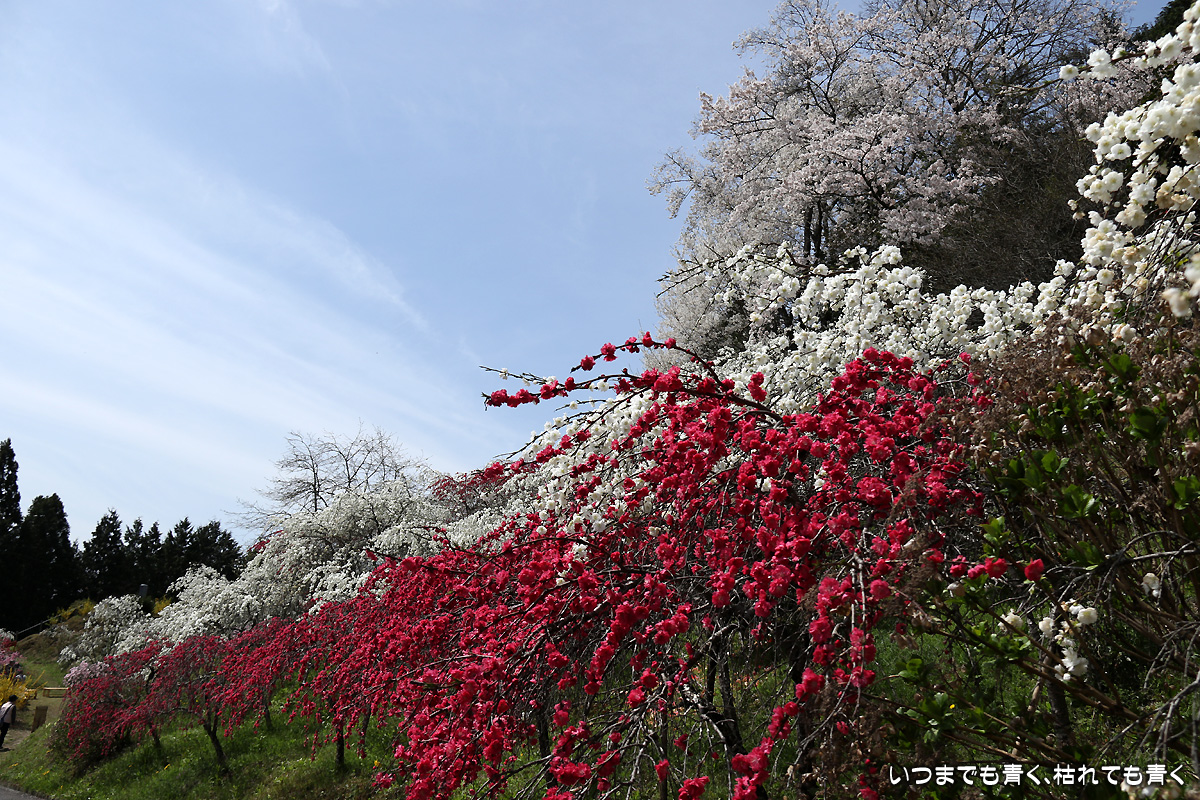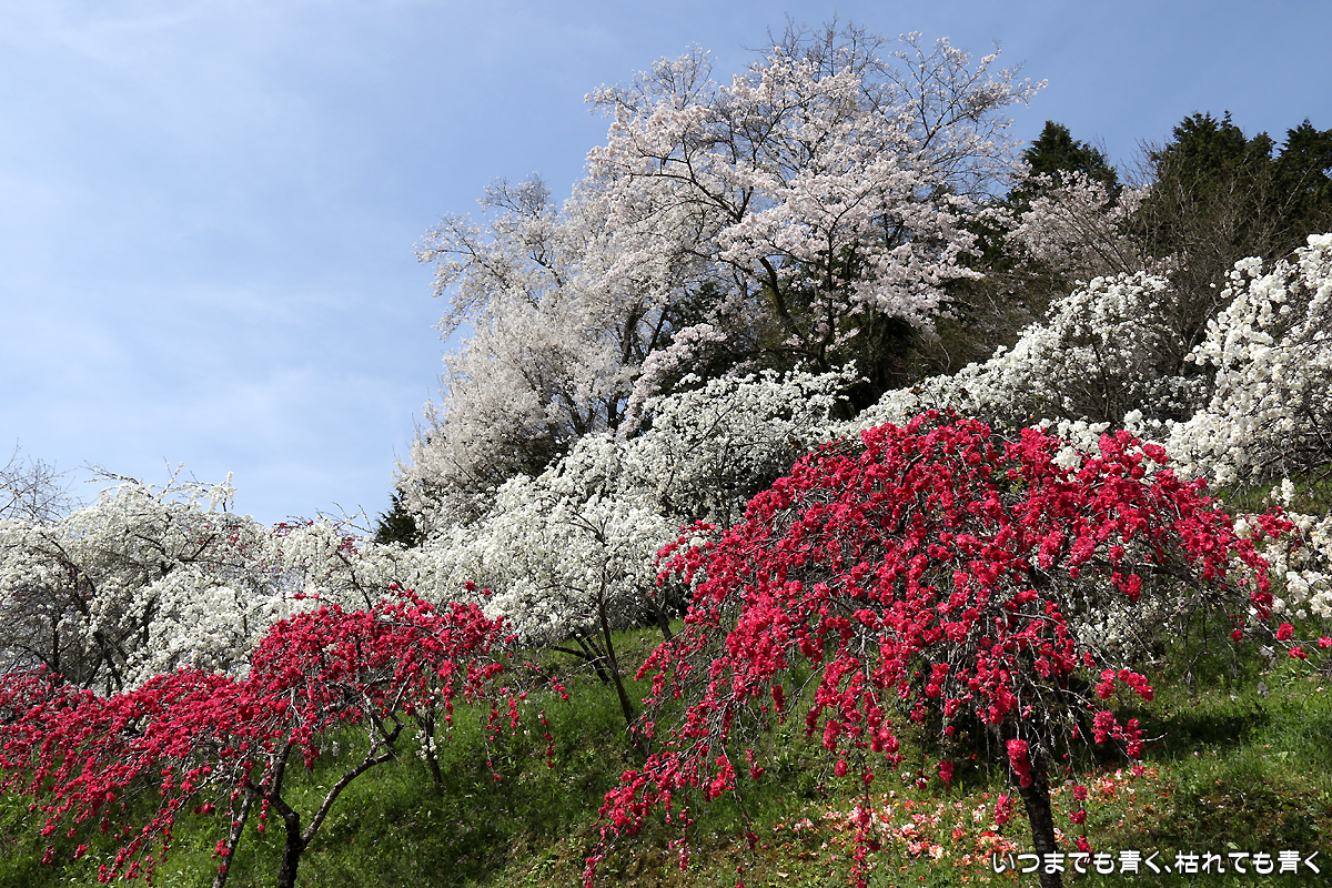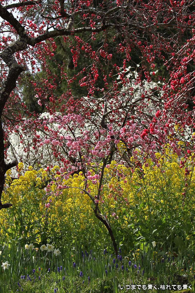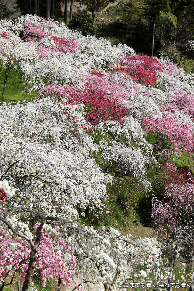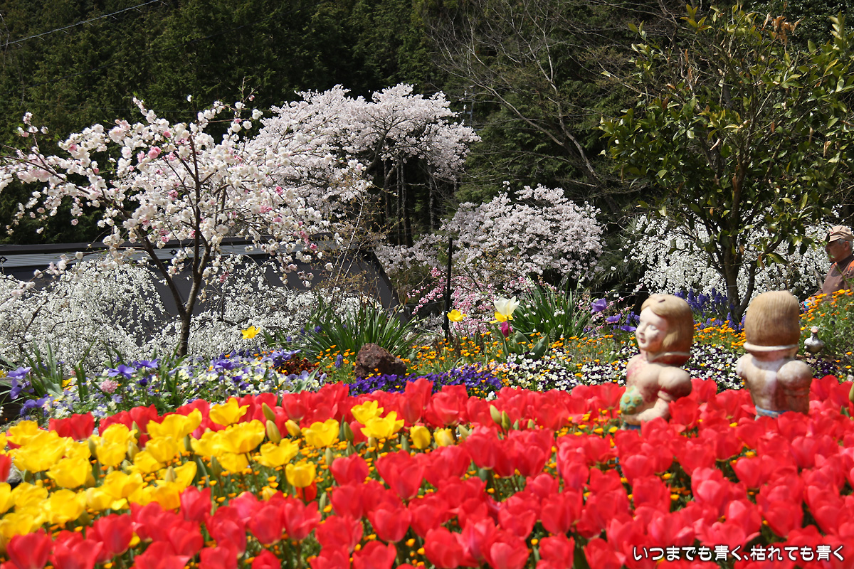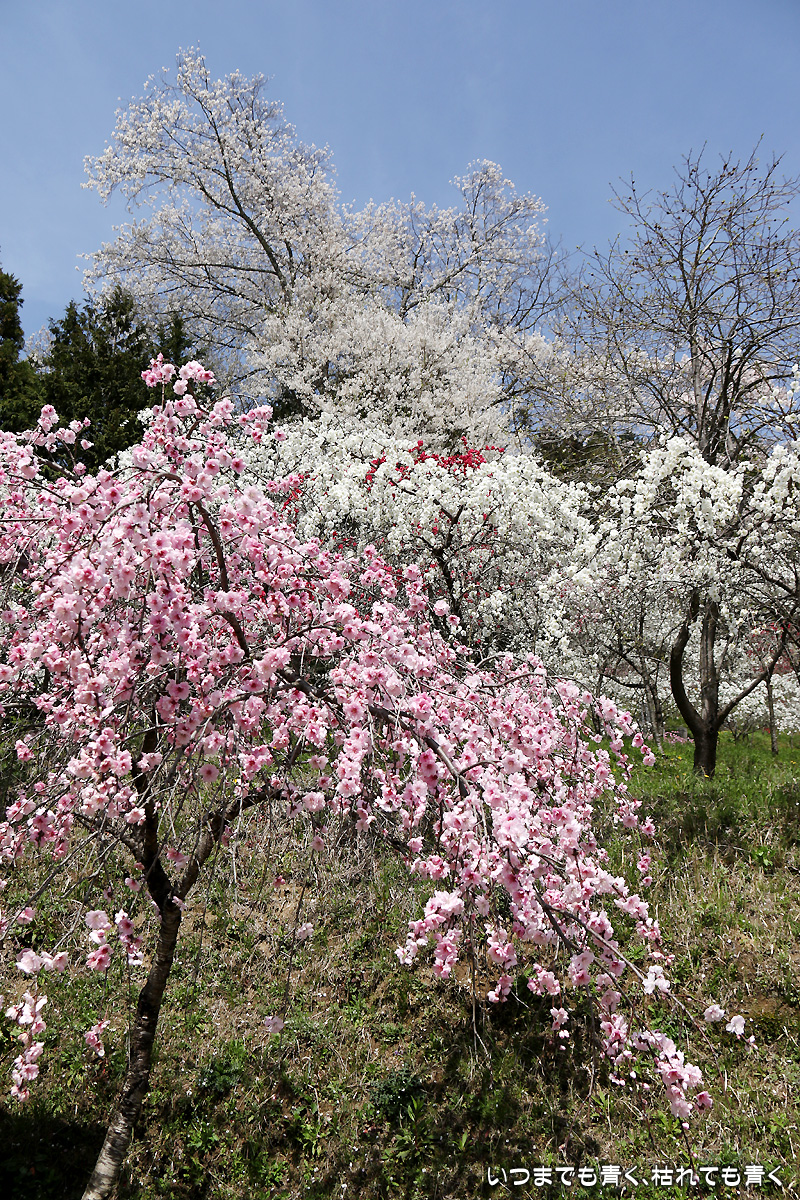 上中のしだれ桃・2016 ぶらりひとり旅 2016年4月9日(土) 20:17 昨年は時期を逸して見逃してしまった上中のしだれ桃。同じ市内にもかかわらずクルマで一時間くらいかかるところなので、今年は天気のいい日に絶対に見ようと思って、昨夜深夜3時までカラオケをしていたにもかかわらず、朝一番でクルマを走らせて見てきました。 今年は、開花の遅れていた山桜との珍しい共演を見ることができましたし、チューリップやスイセンなども咲き誇り、鮮やかな色彩との調和も素敵でした。のんびりと長閑な山間の道を、美しい花を楽しみながら歩く時間は、私にとって至福のひとときです。