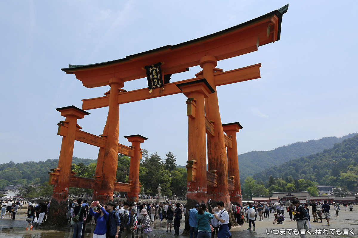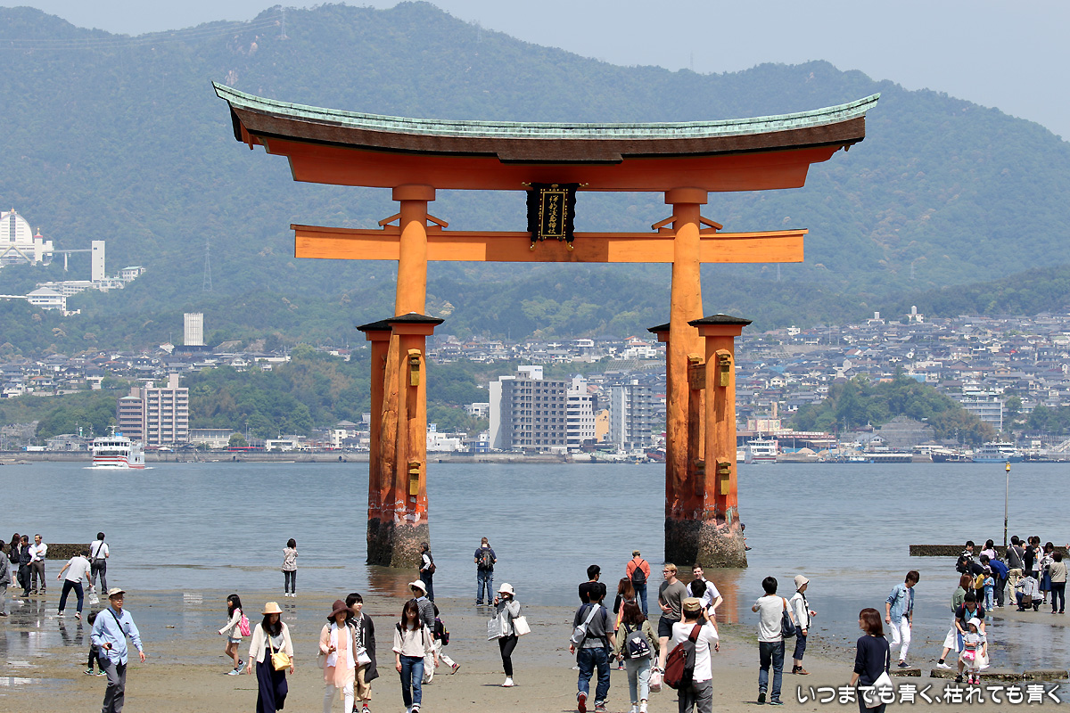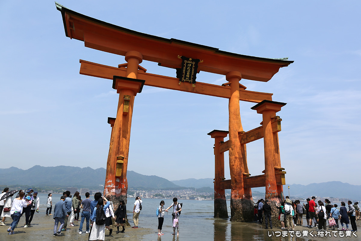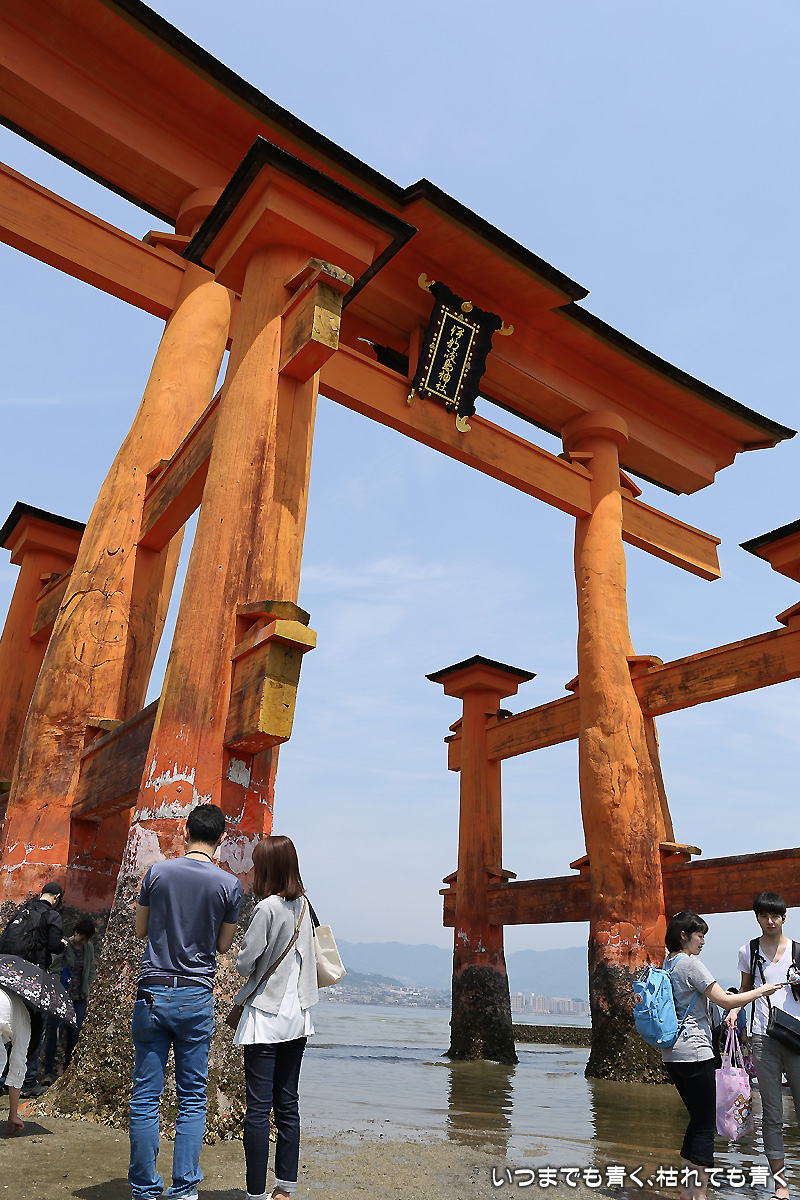 ぶらり家族旅4年ぶりに訪れた宮島・厳島神社。4年前は大鳥居が暴風で損傷を受けて修理中で、その姿を見ることができませんでしたので、海に立つ大鳥居を見るのは今回が初めてとなります。干潮の時刻ともうまくあって、大鳥居の真下まで行くことができて、いろんな方向からの大鳥居や本殿を撮影することができました。