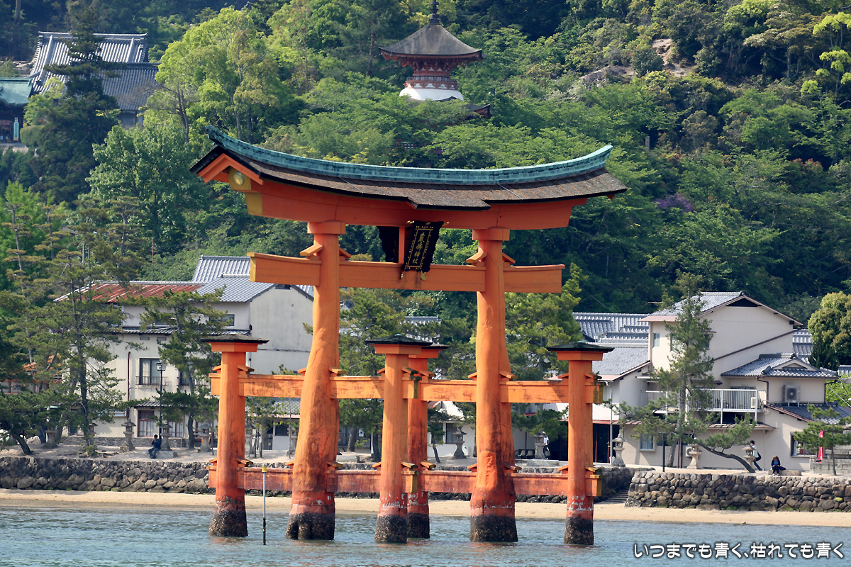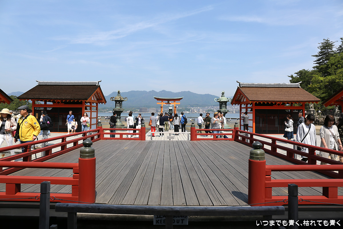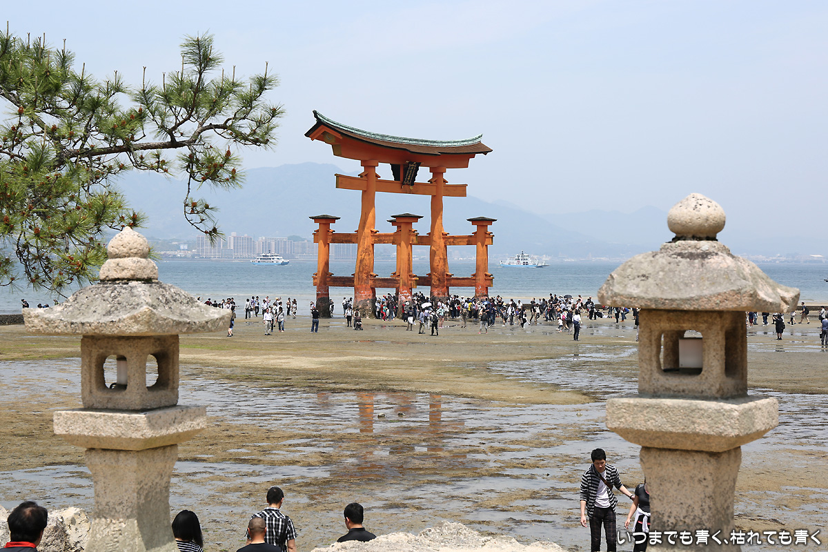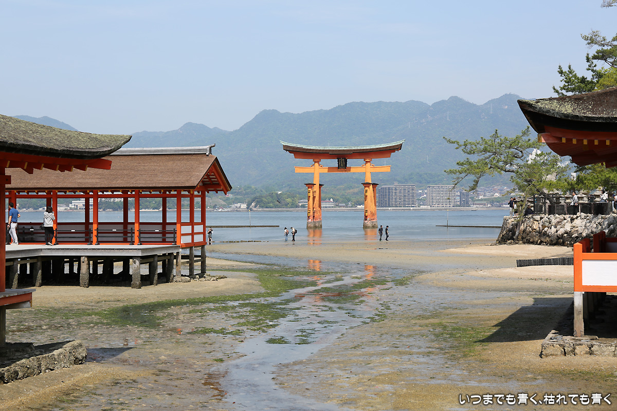 ぶらり家族旅4年ぶりに訪れた宮島・厳島神社。4年前は大鳥居が暴風で損傷を受けて修理中で、その姿を見ることができませんでしたので、海に立つ大鳥居を見るのは今回が初めてとなります。干潮の時刻ともうまくあって、大鳥居の真下まで行くことができて、いろんな方向からの大鳥居や本殿を撮影することができました。