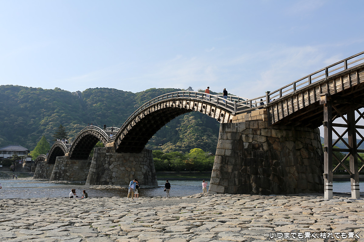 できれば岩国の錦帯橋も見ておきたいと思っていたので、満足気味だった家族の了解を得て宮島を離れ、岩国に向かいました。宮島口から岩国はクルマで30分ほど。初めて錦帯橋を見た印象は、こんな普通の景色の中にあるのかという意外な感覚。なんとなく、もっと行楽地然とした中に立派に存在するものかと思っていたのですが、普通の川に普通にかけられた橋なのですね。しかしその橋の美しさと存在感は際立っていて、いつまで見ていても飽きないものでした。アーチ型なので歩きにくいのではと思っていましたが、歩くととても歩きやすいのも意外でした。岩国城は見学時間は終わっていてには登れませんでしたが、錦帯橋を見ておくことができてよかったです。