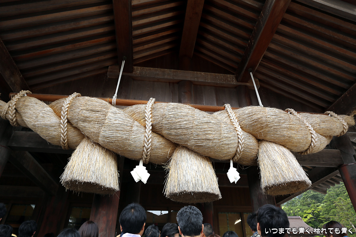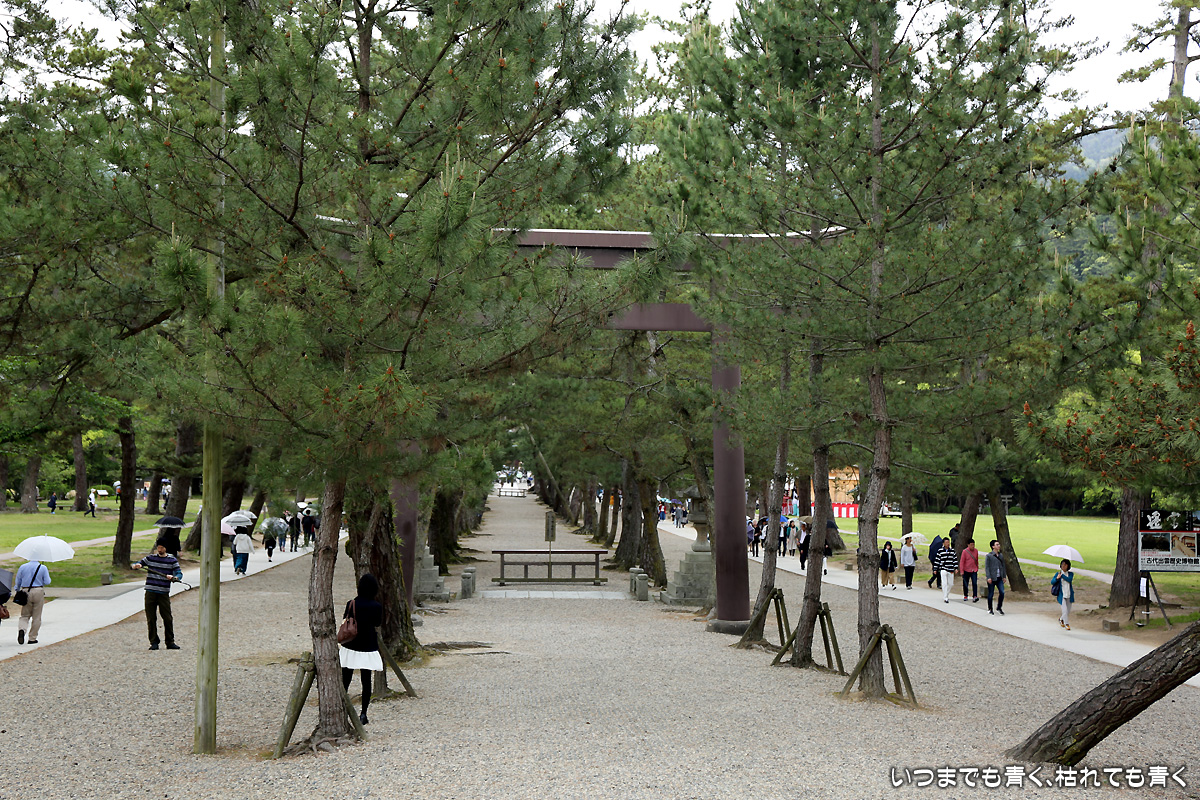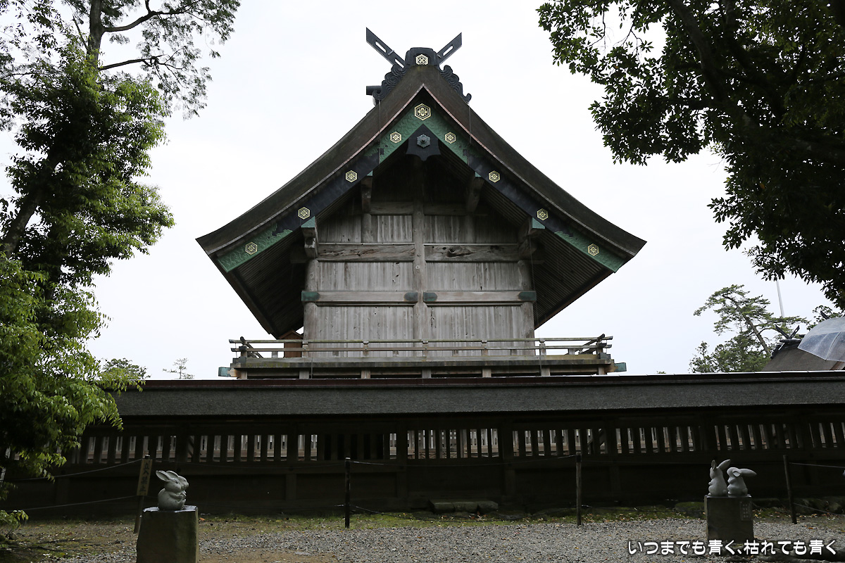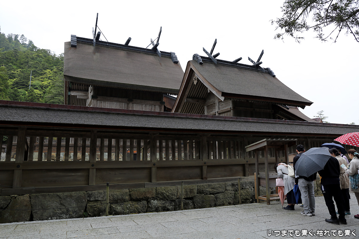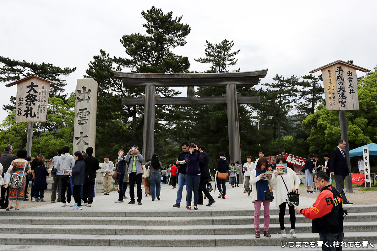 最終日は、初日、二日目の快晴とは違って曇り空。天気予報では昼から雨ということで、急いで広島北ホテルから出雲に向かいます。出雲大社近辺の駐車場はどこも無料で、参拝者にやさしい良心的なところです。出雲大社と一口に言っても、お参りをするのは、何ヶ所もあります。まず勢溜の大鳥居からすぐのところにある祓社にお参り。ちなみに、出雲大社でのお参りは、他の神社とは違い、二拝四拍手一拝でお参りします。手水舎で手を清めたあとは、銅の鳥居をくぐり、大きなしめ縄のある拝殿でお参り。そのあとは奥にある八足門で御本殿に向かってお参り。そのあとは東側、北側、西側と反時計回りに、東十九社、釜社、素鷲社の順にお参りします。その次が一番重要なところになります。御本殿の正面は南向きなのですが、その中の御神座は西向きにあるため、御本殿の西側が大神様の正面になるわけです。御神座正面拝礼所と書かれたところで、大神様に向かい合いどこよりも心を込めてお参りをします。そのあと、氏社、西十九社、神楽殿とお参りし、これで終了となります。最後に、御守所で御守りを買い、拝殿の裏側で御朱印をいただきます。ただ、ゆったりとお参りしたかったところですが、途中から雨が激しくなり、お参りの時は濡れながらなのでゆっくりと心を落ち着けてというわけにはいかなかったのがちょっと残念でした。カメラも濡れないようにバッグに入れてしまいましたので、途中からスマホで撮影した写真となっています。