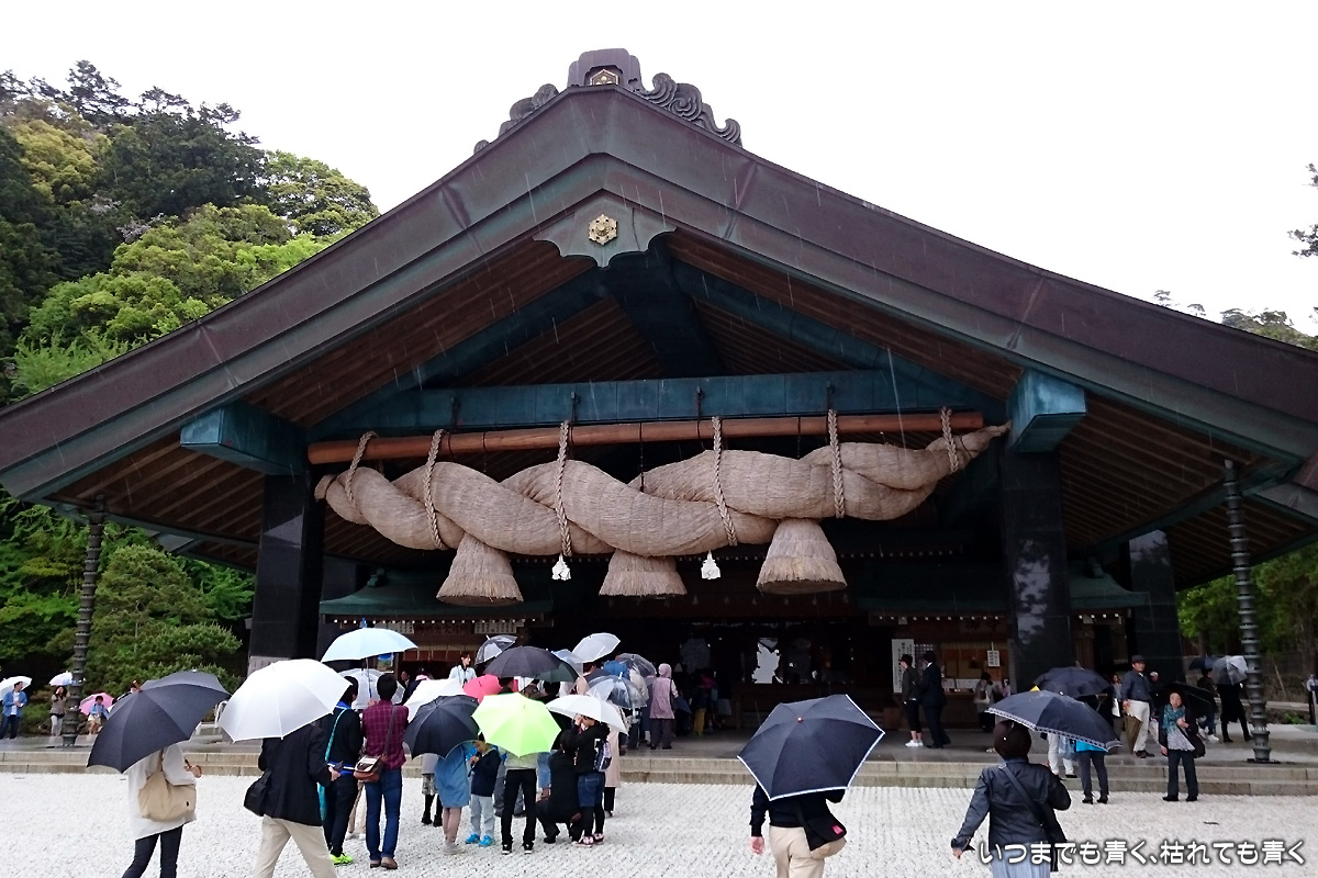 この頃になると天候はもう嵐。雨風が強くなってきて、予定していた鳥取県境港の水木しげるロードへ行くのも中止して、帰路につくことにしました。この最終日はちょっと残念なことが多かったですが、考え方を変えれば、小雨のうちに出雲大社のお参りができたし、出雲そばもなくなる前に食べられたということで、良かったともいえます。