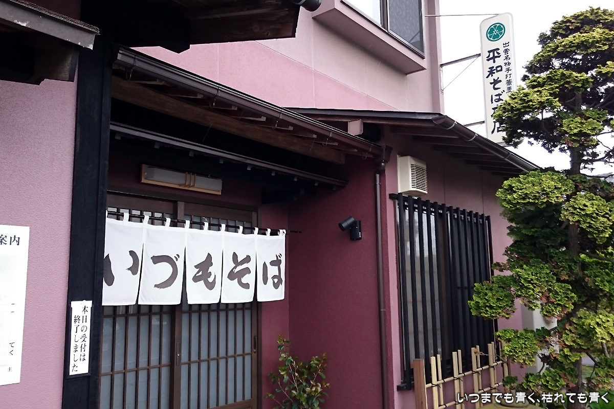 お参りのあとは、出雲そばを抜くことはできませんので、平和そば本店さんで、出雲そばをいただきました。本日分のそば終了間際でヒヤヒヤしましたが、なんとかいただくことができました。店員さんも雰囲気も良く、そばも美味しい店でしたが、対応してくれた一人の店員さんだけ対応が良くなくて、その人のせいで家族も少し嫌な思いをしたのがちょっと残念でした。