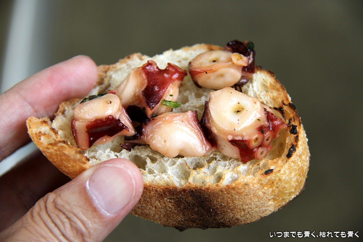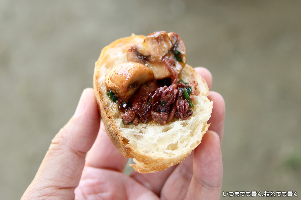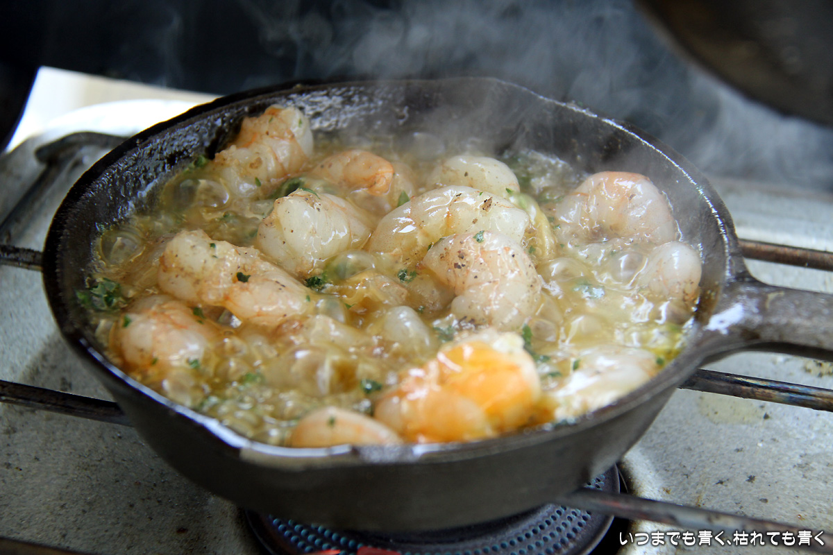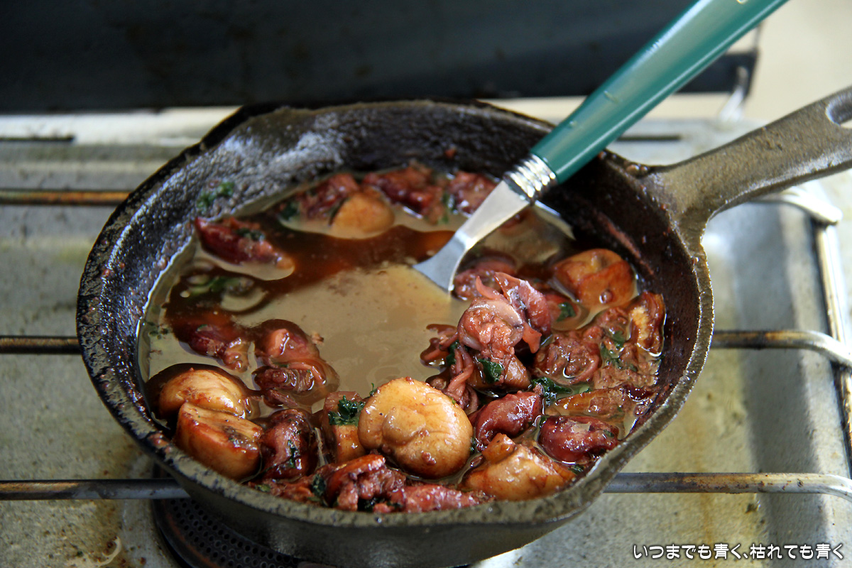 今年のメニューは、アヒージョというオリーブオイルでいろんな具材を煮込む小皿料理で、何種類か作っていただいて、それをパンにのせて美味しくいただきました。合間には、クロダイの丸焼き、ウインナーをいただき、最後は芋煮でしめるというのはいつもと同じです。今年は心身ともに体調も良く、シェフであるつるまるさんの美味しい料理をお腹いっぱいに楽しむことができました。