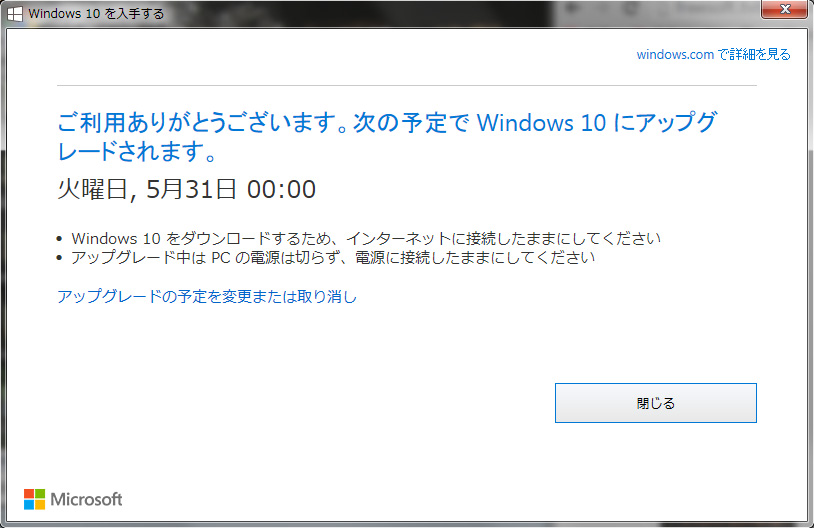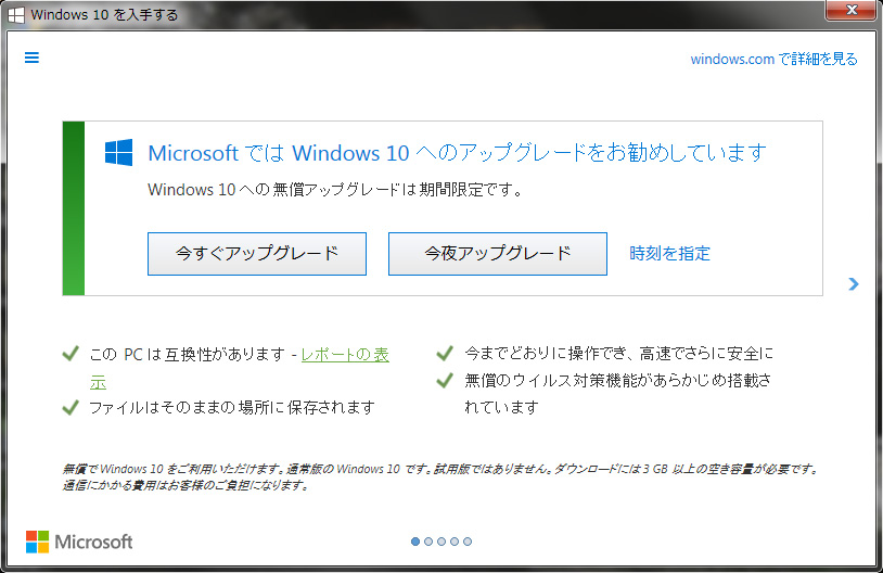 うるさいほどにWindows10にアップグレードを促してくるMicrosoftですが、今夜表示されたものは、巧妙になってきました。