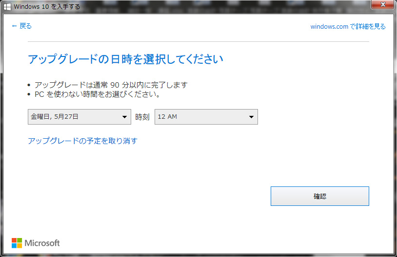 アップグレードの時刻を確定すると、下に「アップグレードの予定を変更または取消し」というメニューが出てきます。それをクリックします。