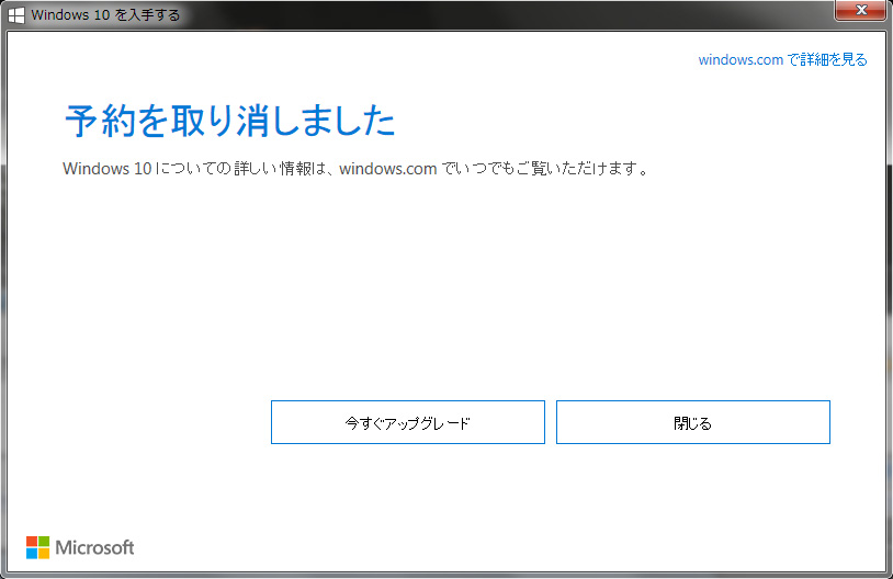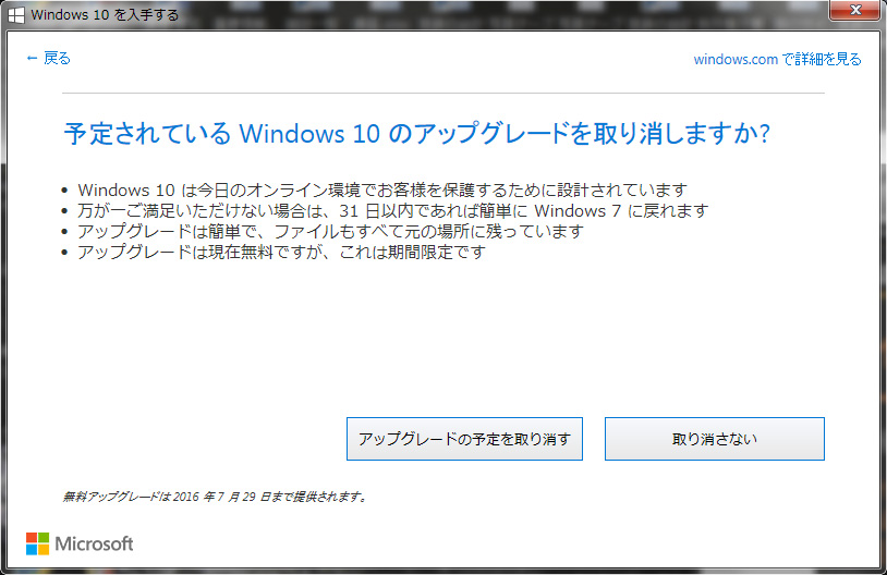 「予定しているWindows 10のアップグレードを取り消しますか?」と尋ねられますので、「アップグレードの予定を取り消す」を選択します。